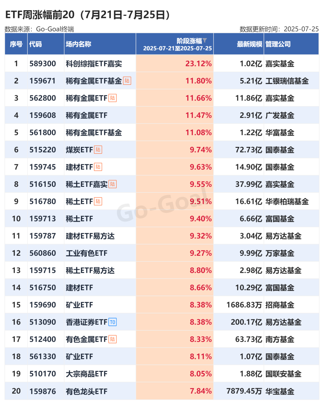 Go-Goal ETF数据显示,本周ETF市场呈现“债基避险+港股科技吸金”的格局。稀有金属、稀土等相关ETF品种继续爆发,“反内卷”方向的煤炭、建材类ETF均大涨近10%。跌幅方面,多只银行相关ETF回调幅度在3%左右。